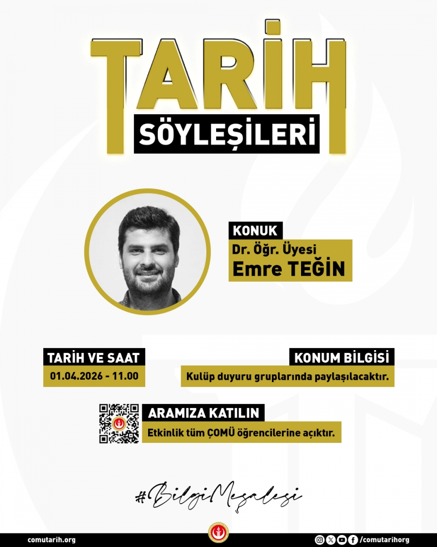 Öğretim üyelerimizden Doç. Dr. Hayrettin İhsan ERKOÇ danışmanlığında yürütülen ÇOMÜ Tarih Araştırmaları Kulübü, 1 Nisan 2026 tarihinde, saat 11.00’de, İnsan ve Toplum Bilimleri Fakültesi 004 Nolu derslikte Dr. Öğr. Üyesi Emre TEĞİN’in katılımıyla tarih söyleşilerinin onuncusunu düzenleyecektir. Etkinliğin diğer detayları ÇOMÜ Tarih Araştırmaları Kulübü duyuru grubunda paylaşılacaktır. Etkinlik tüm ÇOMÜ öğrencilerine açıktır.
